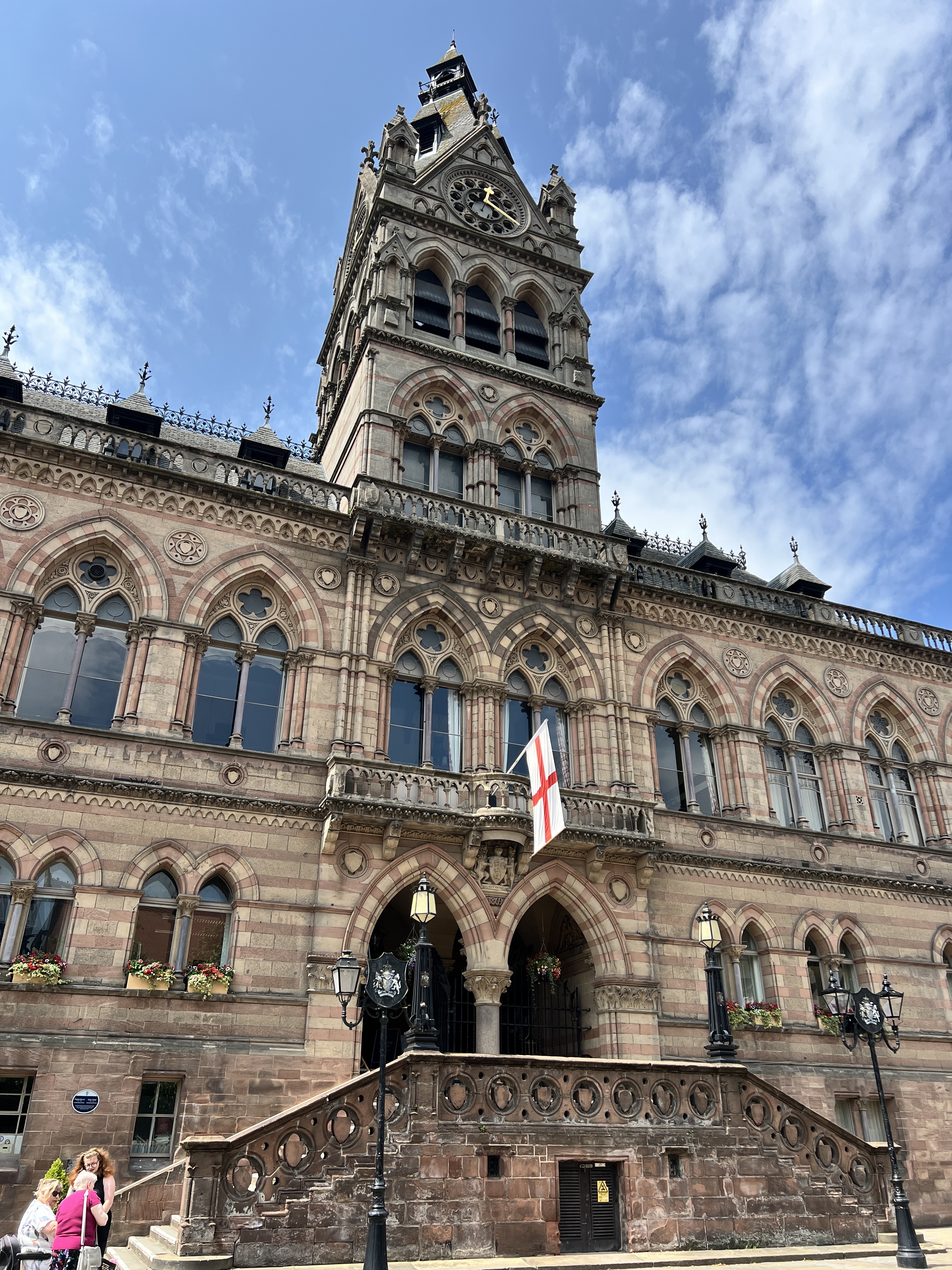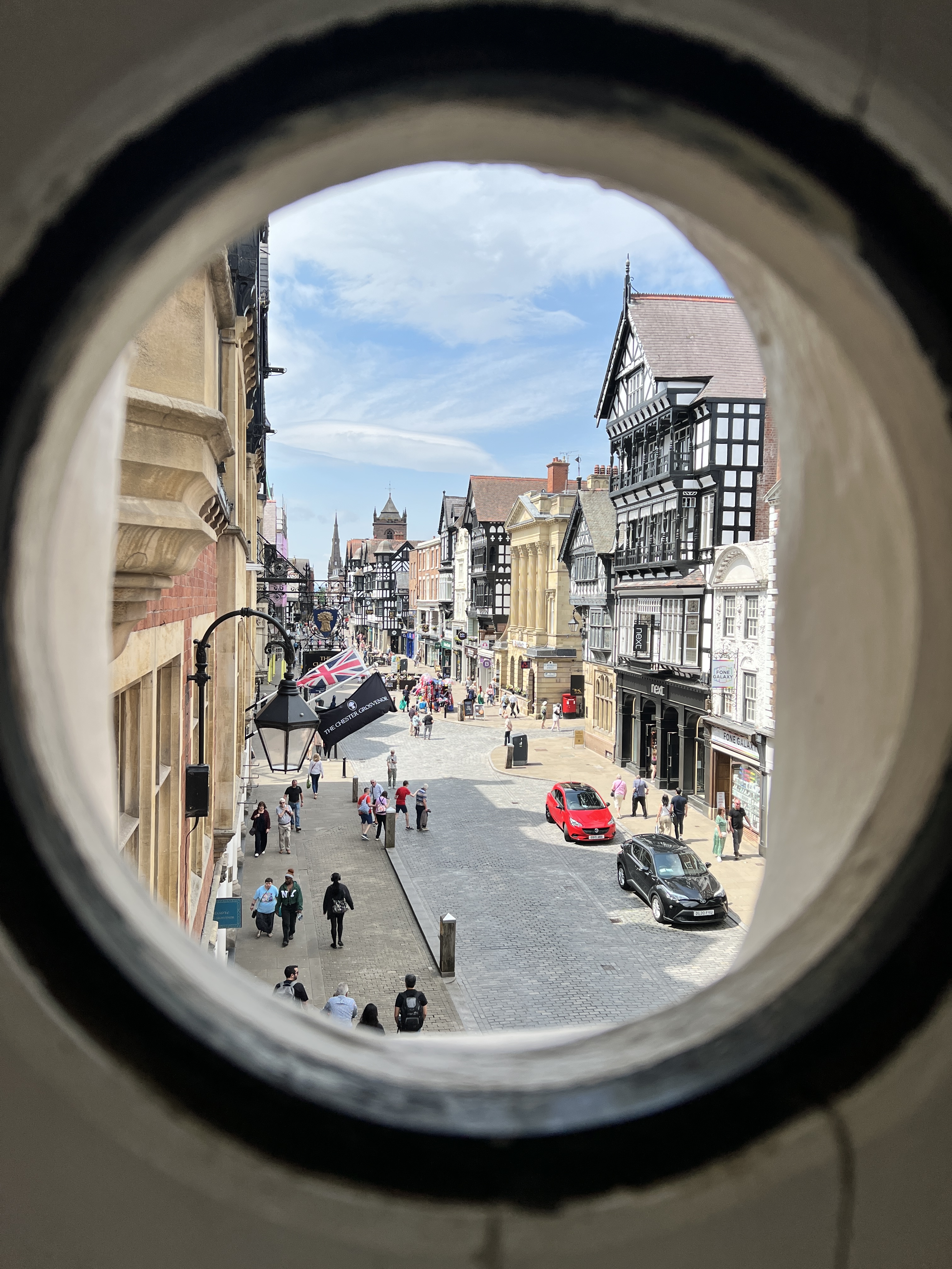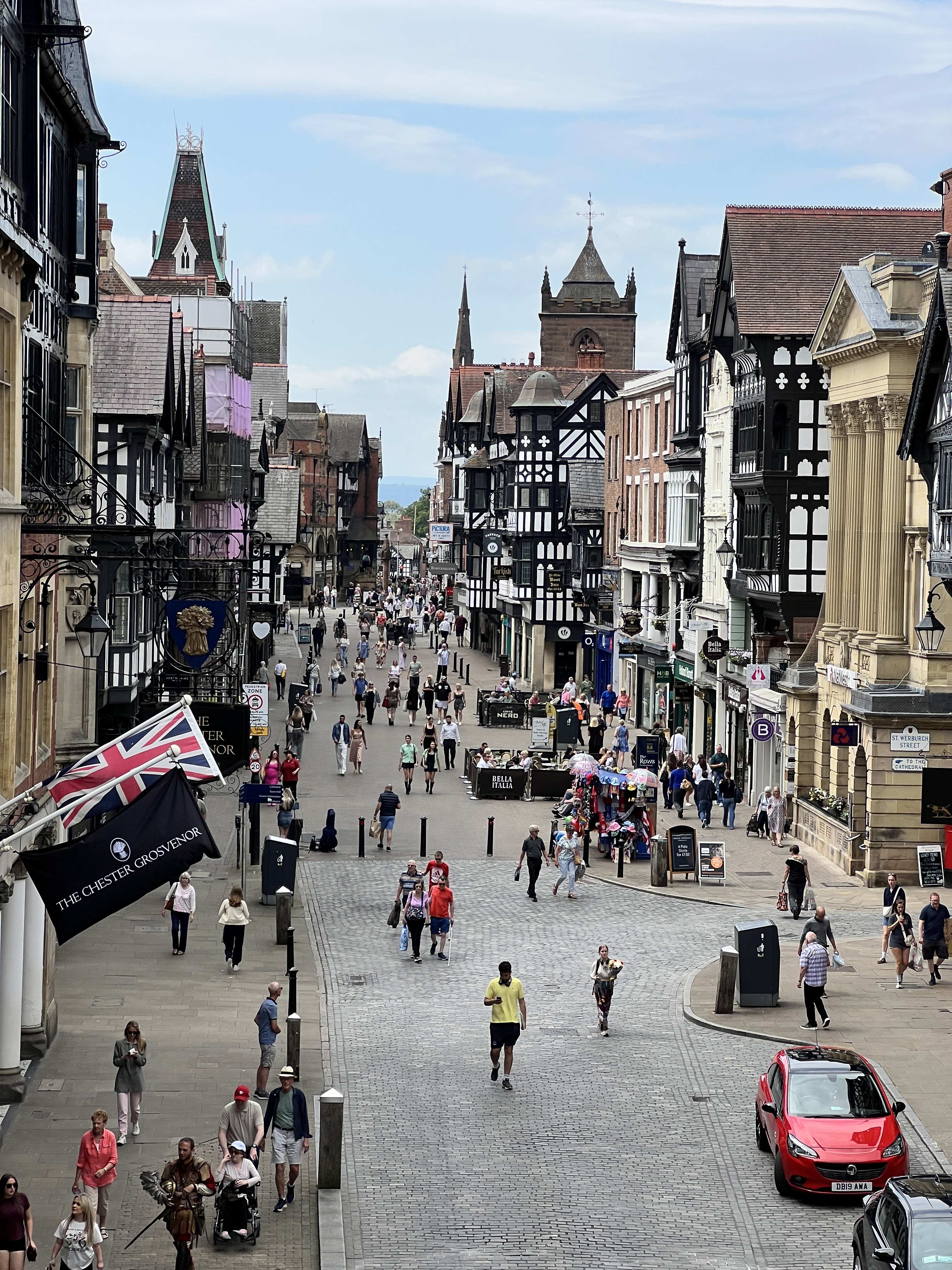 It has a Roman wall, medieval architecture, and a lot of black-and-white timbered buildings.